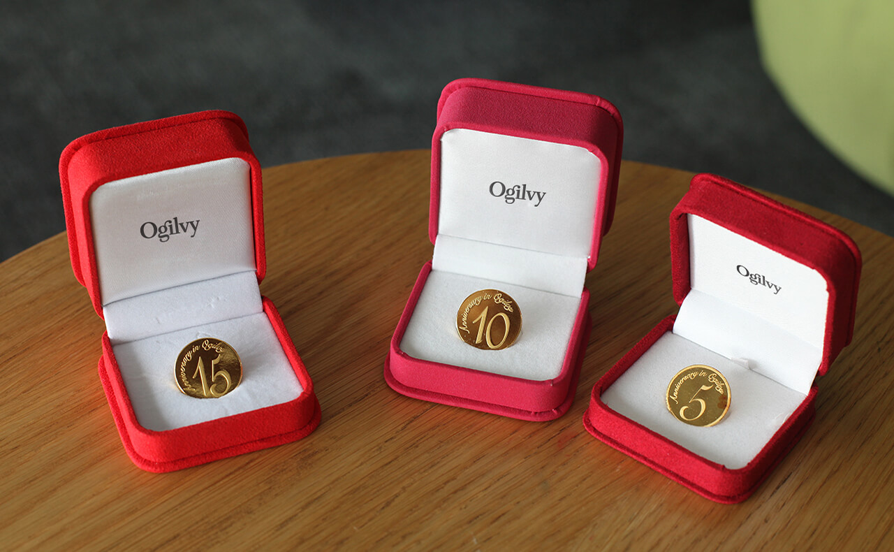 6月23日的D.O. Day是祖师爷奥格威的诞辰纪念日,公司每年都会举办不同主题的活动来庆祝,例如“世界杯”主题、“孩子我撑你”主题、“全民装扮奥格威”主题等等。除了会组织丰富多彩的活动,公司还会于当天给在奥美工作满5年、10年、15年……的员工发放奥美定制金币。