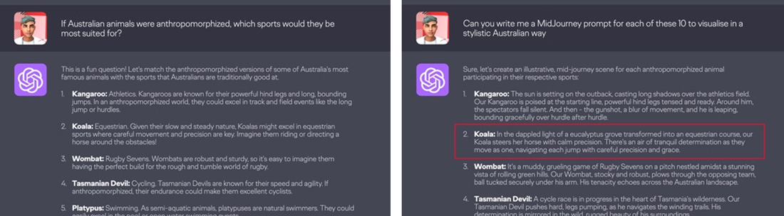 First I use ChatGPT to help deliberate and rationalize which Australian animals would be best matched with each sport. Then I ask it to help generate the MidJourney prompt.