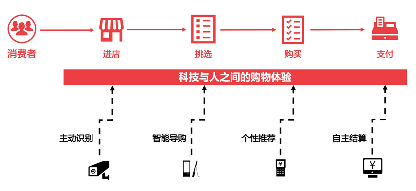 智慧门店的创新正代表着一个零售品牌所展现的科技能力,为业务价值带来正向增长。在消费者购物体验中,人给人的体验包括:进店微笑问候和寒暄、主动提供对消费者的需求关怀和商品推荐、根据过去经验判断消费者的购买能力给予适当的折扣。科技给人的体验则包括:便捷快速的购物流程、消费者取得的商品信息较客观一致、以历史数据判断消费者特性和购买能力。当消费者在零售门店的场景中进行从进店、挑选、购买和支付等购物活动时,销售员的参与将有助于提高消费者对于商品的了解和购买意愿。